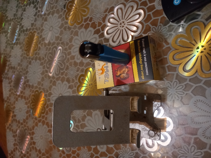 A blue lighter rests on a yellow and red pack of Camel cigarettes. A gray, metallic object with a rectangular opening and some intricate rusted detailing sits below. The composition is arranged on a patterned tablecloth, featuring reflective floral designs. A dark electronic device is visible at the upper right. The overall scene is illuminated with an unknown light source, casting reflections and shadows on the various surfaces.