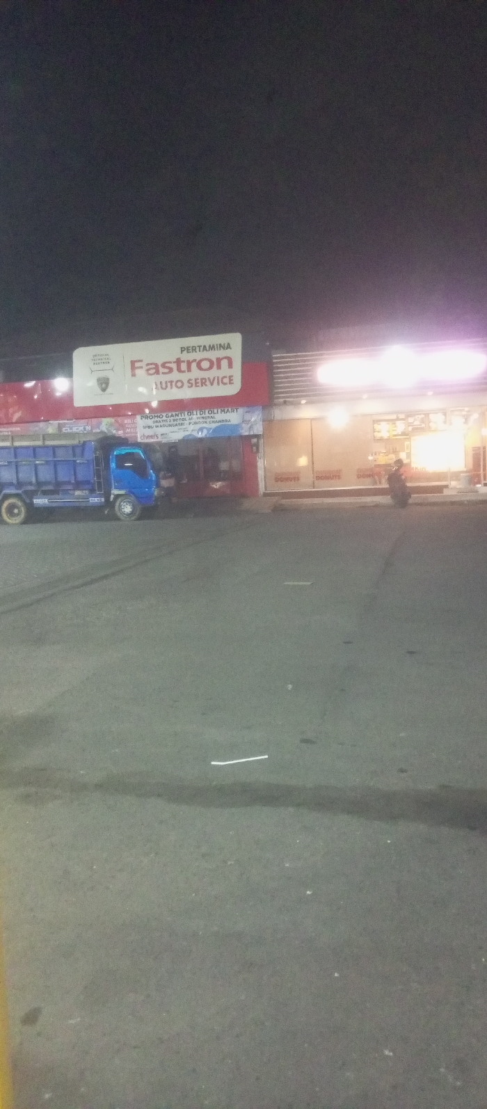 A blue truck is parked in front of a Pertamina Fastron Auto Service center at night. The auto service center advertises a "PROMO GANTI OLI DI OLI MART" (oil change promotion) with "cheer's" branding. To the right of the auto service center is a donut shop with illuminated displays. A person on a motorcycle is visible near the donut shop's entrance. The ground is paved and dimly lit. The night sky is dark.