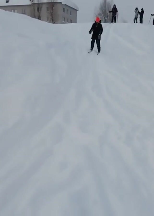 person skiing down a snow-covered hill. The skier is wearing a black outfit and a red hat. Other people are standing at the top of the hill. The skier falls down. Ski poles and tips of the skis are visible after the fall. The background includes a building and trees. The sky is overcast.