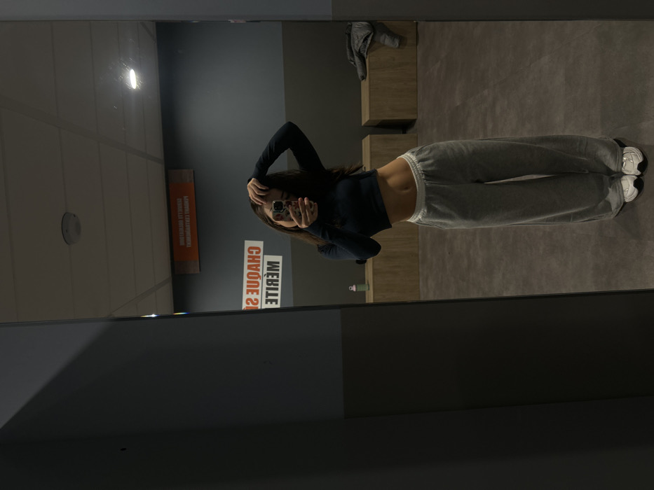 A young woman is depicted in a mirror selfie taken within what appears to be a fitness center changing room or common area in Hœnheim, France