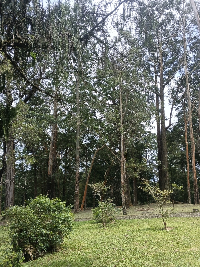 A lush, green meadow slopes upward towards a dense forest of tall, slender trees. The trees vary in size and foliage density, with some featuring hanging tendrils. Smaller shrubs dot the foreground, adding layers to the landscape. The light filters through the tree canopy, creating an ethereal ambiance.