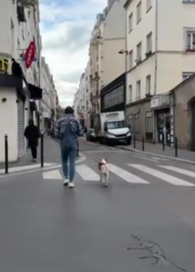 A person wearing overalls and white shoes walks away from the camera, leading a dog across a crosswalk. The street is lined with buildings, some with shops. A white van is parked on the right side of the street. A person walks on the sidewalk on the left. The street is wet and there is a faint leaf marking on the pavement.