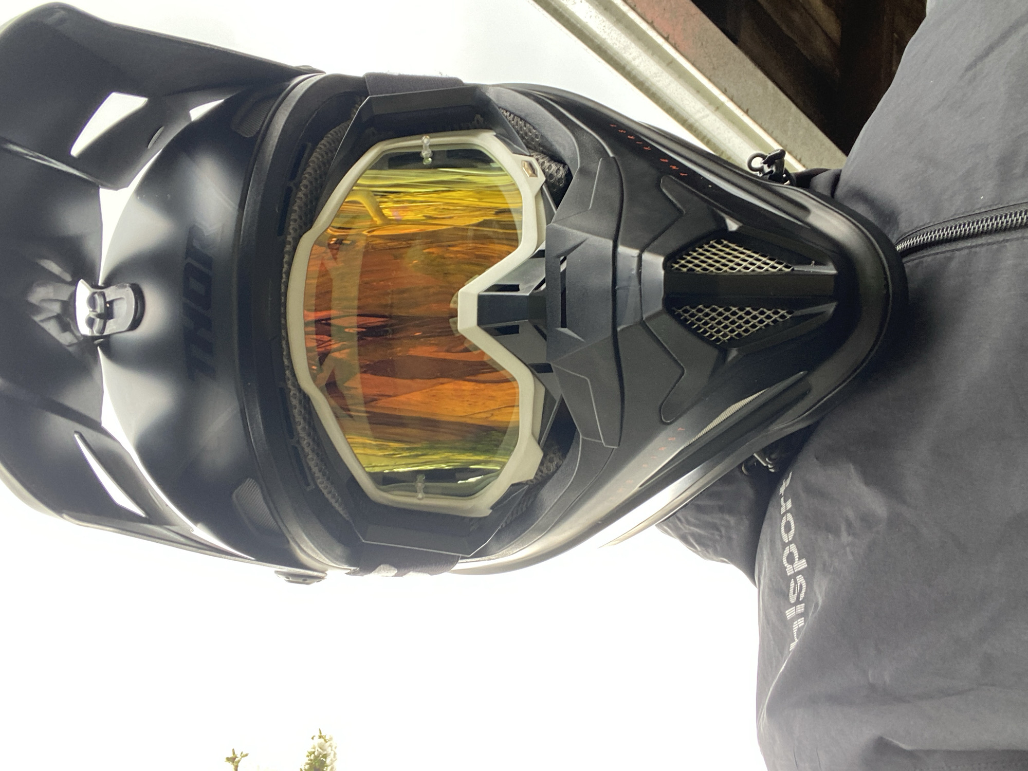 A black motocross helmet with amber-tinted goggles is the primary subject of the image