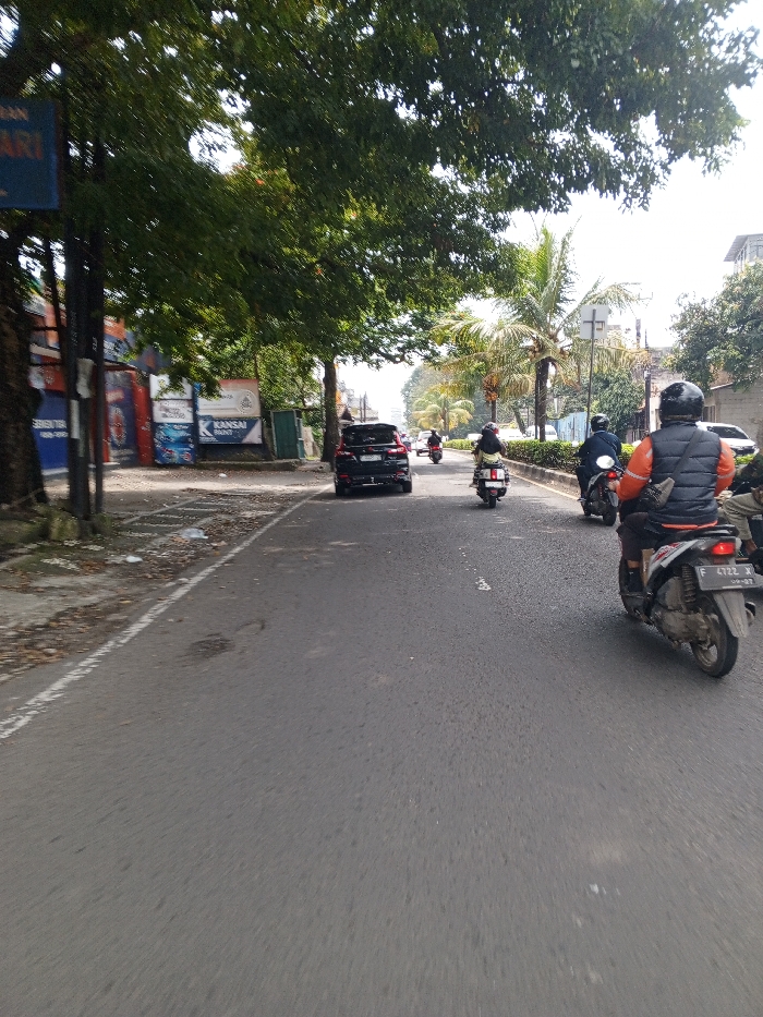 This image depicts a daytime urban street scene in the city of Multhan, India. The perspective is from a low angle, likely from a moving vehicle, looking forward along an asphalt roadway. The immediate foreground features the rear of a white scooter with a visible license plate "F 4722 X" and a date stamp "09-27". The rider, facing away from the camera, is wearing a black full-face helmet, an orange padded vest over dark clothing, and dark pants. A dark shoulder bag is slung on the rider's left side. The roadway, which appears to be multi-lane, has a white solid line delineating its left edge. Several vehicles are present. In the midground, ahead of the foreground scooter, a dark-colored motorcycle is ridden by an individual in dark attire and a dark helmet. Further ahead, a light-colored scooter is ridden by a person wearing a light-colored helmet. In the left lane, a black SUV is moving in the same direction. Additional vehicles, primarily motorcycles, are visible receding into the background, indicating ongoing traffic. To the left of the roadway, a rough, partially paved shoulder or sidewalk is visible, bordered by dark utility poles and large trees with dense green foliage that partially obscure the sky. Beyond the trees, commercial structures feature various signs, including a partially visible blue sign with white text, and another sign displaying "KANSAI PAINT" in blue lettering on a white background. To the right of the roadway, a landscaped median strip with green shrubs separates the lanes. Beyond this median, several palm trees are visible, along with distant buildings and additional vegetation. The sky is bright and appears overcast, providing diffused daylight.