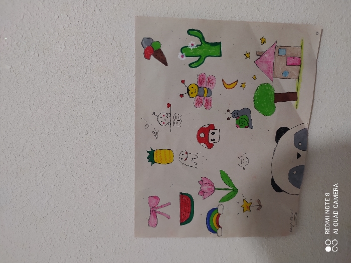 A drawing on beige paper depicts a variety of whimsical images. These include an ice cream cone, a cactus, a butterfly, a snail, a mushroom, a ghost, a flower, a watermelon, a rainbow, a star, a pineapple, a house, a moon, and a bow. Part of a panda's face is visible on the bottom right. The drawing appears to be affixed to a textured, light-colored wall.