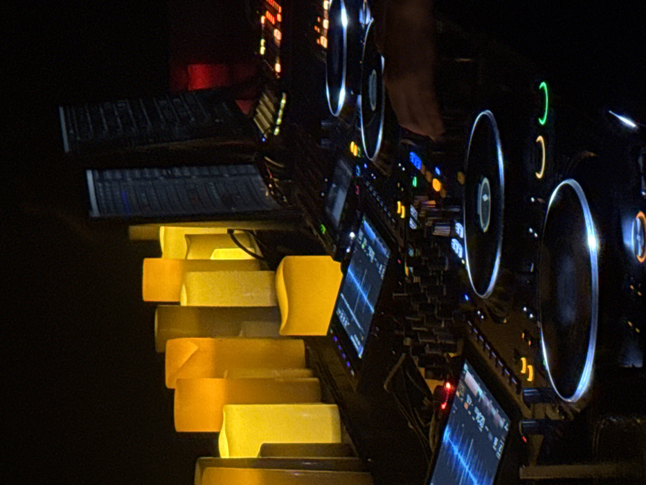 The image displays a low-light, interior scene of a nightclub or lounge in Monterrey, Mexico. The foreground features professional DJ equipment, including multiple DJ media players with illuminated white and blue jog wheels and integrated digital screens displaying audio waveforms. A DJ mixer is centrally located among the players, characterized by numerous knobs, faders, and illuminated buttons in various colors (blue, green, orange, red). A human right hand is visible on the right side of the frame, actively operating a jog wheel on one of the DJ players. To the left and extending into the background, a row of numerous glowing, pillar-shaped objects, consistent with LED candles, provides warm yellow and orange ambient lighting. These candles vary in height, and some exhibit irregular top edges. In the background, two tall, dark, rectangular structures, possibly speakers or architectural features, are partially discernible.