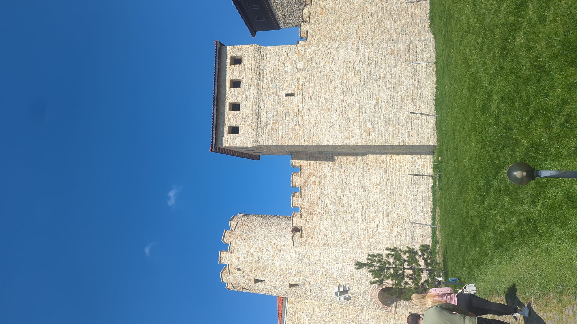 The image depicts a tall, light-stone castle building set against a clear blue sky with a few wispy clouds. The castle features a square tower with crenellations and small window openings. Adjacent to the tower is a section of the castle wall with crenellations and a cylindrical tower. Below the castle wall, there is a well-maintained green lawn. A street light is visible on the lawn, and at the bottom of the image, two people are visible. The location is Unknown, Unknown.