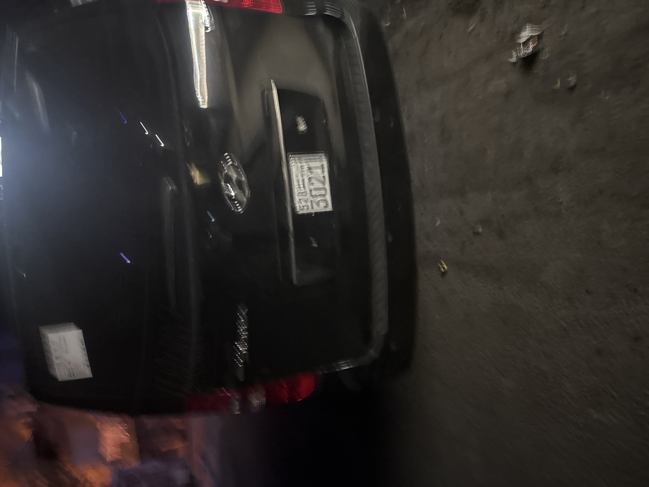 A dark-colored vehicle is parked on a dark, possibly asphalt, surface. The rear of the car is visible, featuring taillights and a license plate. The plate has the number "5021" on it. There is some blurry or out-of-focus detail below and to the left of the car, and some debris on the ground to the right. The image is rotated slightly, creating a tilted perspective.