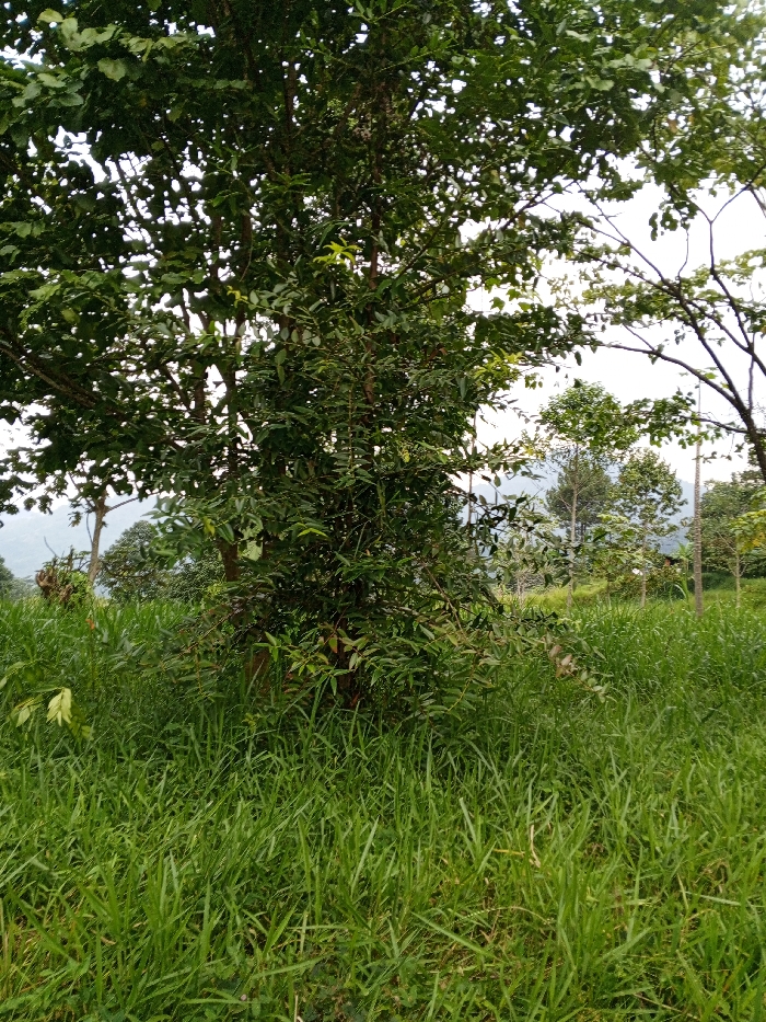 The scene depicts an outdoor, vegetated environment in Thotagamuwa, Sri Lanka. The foreground is covered with dense, knee-high green grass. Centrally positioned in the midground is a mature tree with multiple trunks and abundant, dark green foliage, obscuring its lower trunk from view. Behind this primary tree, sparse vegetation and younger trees extend into the background. A distant, hazy mountain range is visible on the horizon beneath a light, overcast sky. No individuals, animals, or artificial structures are discernible.
