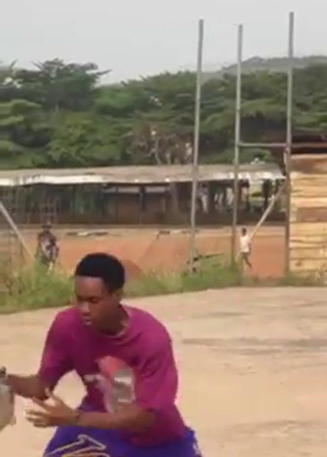 A young man in a maroon t-shirt and Lakers shorts throws a ball into the air and catches it. The scene is outdoors, likely on a sports field or court. There are other people in the background, and the setting appears to be a recreational area with buildings and netting visible in the distance.