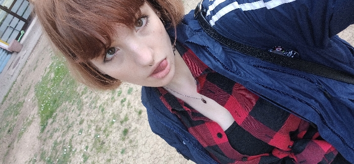 A medium close-up photograph depicts an individual with reddish-brown, chin-length hair and bangs, light skin, and brown eyes enhanced with dark eyeliner. A small septum piercing is visible on the nose. The individual's mouth is slightly ajar with the tongue extended. The person is wearing a red and black plaid button-down shirt, unbuttoned over a dark undergarment, topped with a navy blue athletic jacket featuring three prominent white stripes on the right sleeve. A silver-colored chain necklace with a dark, possibly crystalline, pendant hangs around the neck. A black strap, consistent with a shoulder bag or backpack, crosses the individual's left shoulder. The background consists of cracked, dry earth interspersed with patches of green grass and small white flowers. In the upper right, a blurred structure displaying blue, white, and yellow elements, possibly part of a building or fence, is partially visible. The scene is outdoors. There are no specific visual indicators within the image to confirm the location as Bar, Montenegro.