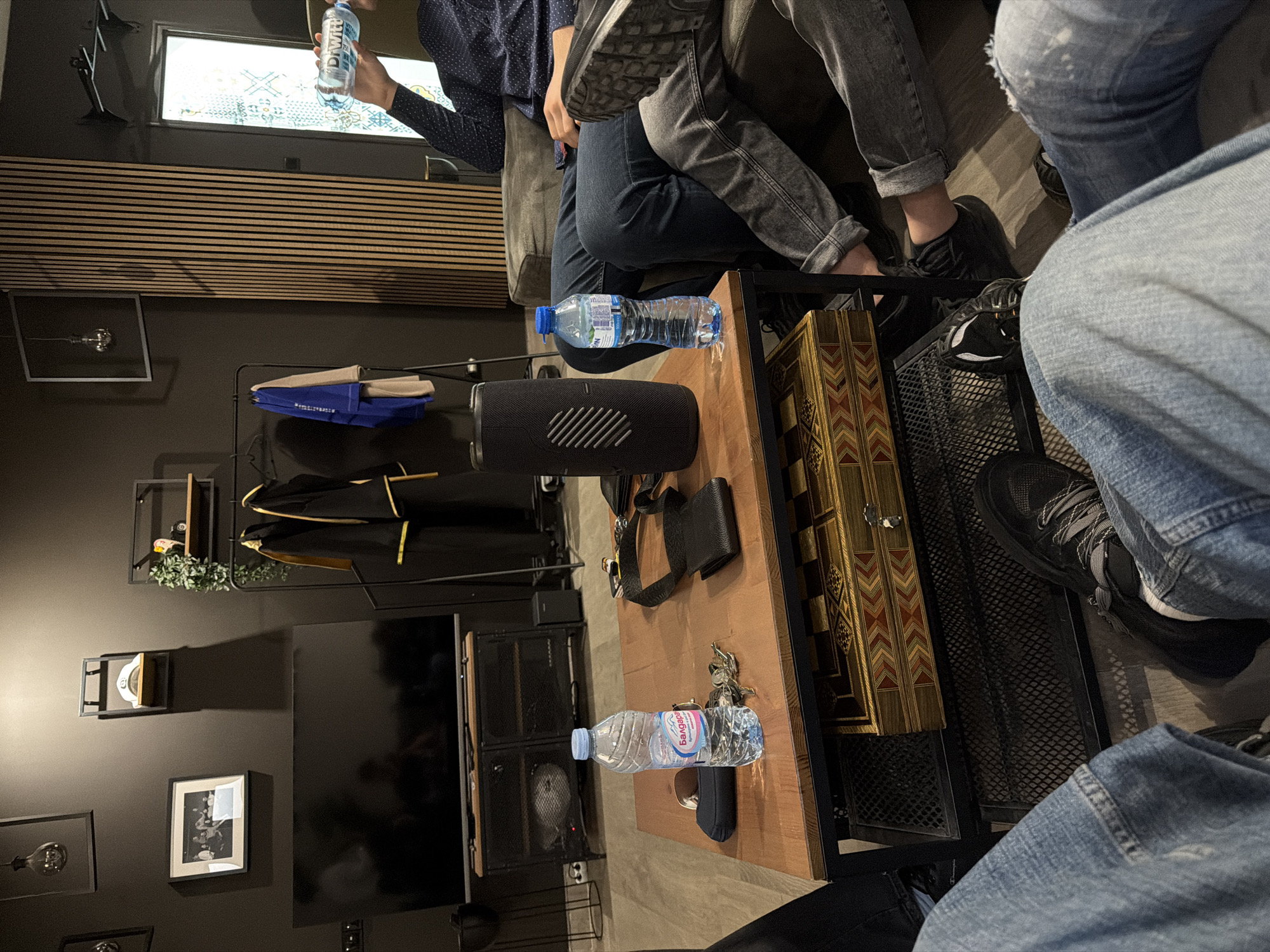 The image depicts an interior scene. Three people are partially visible, their legs and feet positioned around a coffee table. One person holds a water bottle. Another person has a foot resting on another person's leg. The coffee table contains a speaker, a water bottle, wallets, and a backgammon set. Background features include wooden wall paneling, a television, and decorative wall hangings. The location is Sofia, Bulgaria.