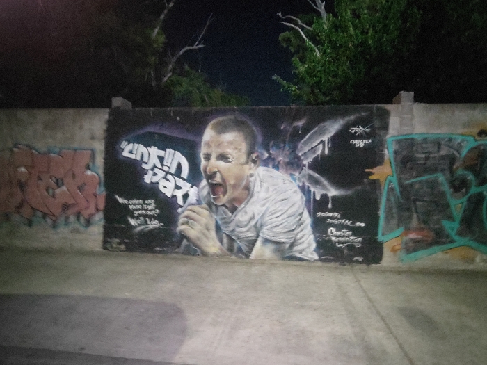 A graffiti mural shows Chester Bennington, vocalist for Linkin Park, singing into a microphone. The mural is painted on a concrete wall, flanked by other graffiti art. Text on the mural includes "Linkin Park" and a quote. The mural also includes signatures or tags. The overall scene is captured at night, with trees and the night sky visible in the background. The mural appears to be a tribute to the late singer.
