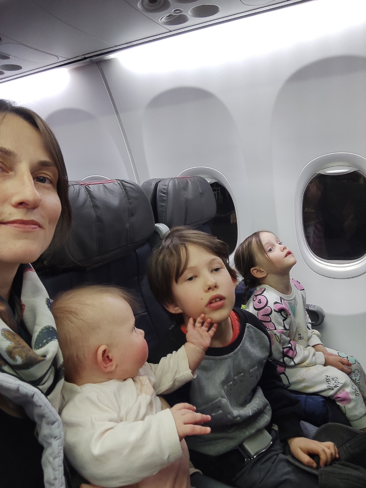 The image displays the interior of an aircraft cabin. The specific city location of Izhevsk, Russia, is not ascertainable from the visual evidence presented. Four individuals are positioned in the passenger seating area. An adult female, partially visible on the far left, has brown hair and a neutral expression. She wears a patterned scarf and holds an infant, who is dressed in a light-colored long-sleeved garment and looks towards the right. Seated immediately to the infant's right is a young boy with brown hair, wearing a gray and black long-sleeved shirt with a visible seatbelt. His left hand is raised towards his face, and he gazes forward. Adjacent to him, next to a circular aircraft window, sits a young girl with brown hair, wearing a white patterned long-sleeved top, looking upwards and to the right. The cabin environment includes dark gray passenger seats with red trim, white overhead panels featuring vents and lighting, and two aircraft windows that reflect dark external conditions.