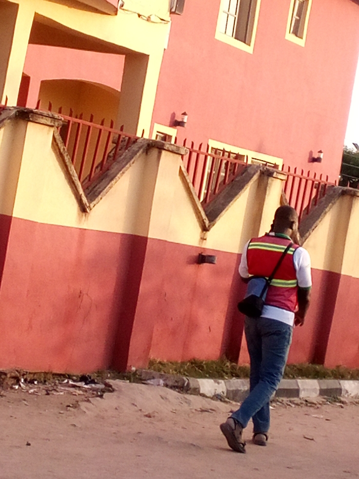 In the city of Unknown, Unknown, a male individual is depicted from behind, walking away from the camera on an unpaved, dusty road. He wears a white short-sleeved shirt, a red vest with horizontal green and yellow stripes, blue jeans, and dark sandals. A dark-colored cross-body bag is slung over his right shoulder. To his left, a perimeter wall features a lower dark-red section and an upper light-yellow section, topped with a zigzag concrete pattern and red metal railings. Behind this wall, a multi-story building with a pink/salmon facade is visible, featuring two white-framed windows and two wall-mounted light fixtures. A yellow architectural element is partially visible on the building's lower section. A concrete curb separates the dirt road from a narrow strip of grass and debris adjacent to the wall. The scene is illuminated by bright daylight, casting visible shadows.