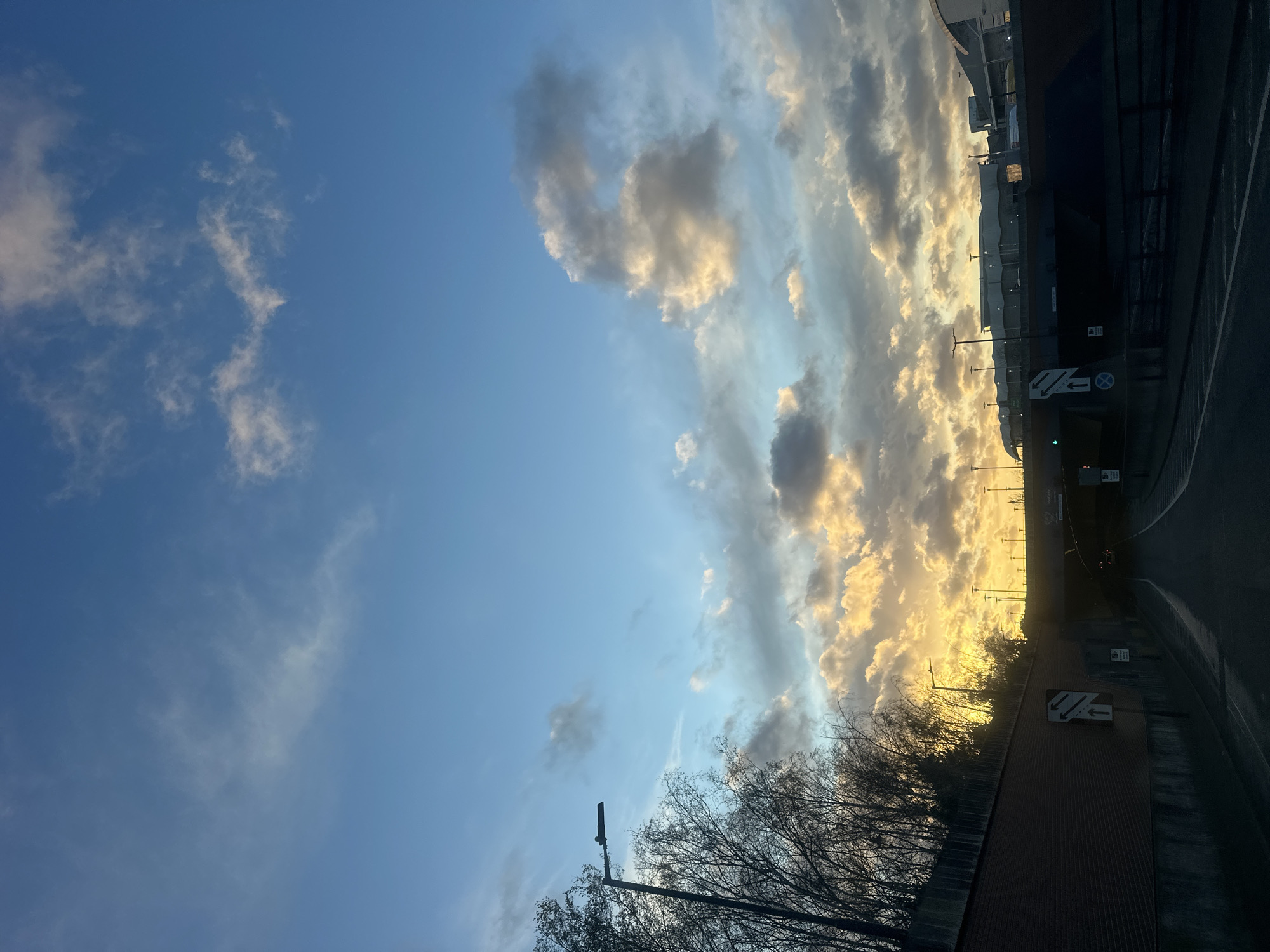 The image depicts a road approaching an underpass in Chatham, United Kingdom, specifically appearing to be an approach to the A2 (New Road) underpass near the Pentagon Shopping Centre. The scene is illuminated by either sunrise or sunset, evidenced by the low-angle golden light on the clouds and horizon. The upper portion of the frame features a clear blue sky interspersed with scattered cumulus clouds, which are tinged golden and orange along their undersides towards the lower horizon. In the foreground, an asphalt road with multiple lanes slopes gently downwards, appearing wet or reflective. White lane markings are visible. The road leads directly into a dark underpass or tunnel in the center of the lower frame. On the left, a tall, dark brick retaining wall runs alongside the road, topped by a dense growth of bare deciduous trees silhouetted against the bright sky. A modern street light with a flat, rectangular head extends from the left margin above the trees. A white traffic sign with diagonal black stripes and an upward arrow is mounted on a pole near the wall, indicating lane direction, with a smaller blue 'P' parking sign beneath it. On the right, above the underpass entrance, a dark, elevated structure spans the road. Above this, a large building complex with distinctive curved or wave-like rooflines is visible, appearing illuminated. Numerous street lights with similar flat, rectangular heads are positioned along this elevated structure and around the building. A green traffic light is visible above the underpass entrance on the right. Another white traffic sign, mirroring the one on the left, is present on the right, also with a blue 'P' parking sign. Faint text on an overhead sign above the underpass includes "CHATHAM." The underpass itself is dark, with internal lighting or distant vehicle lights faintly discernible within. No individuals or specific vehicles are clearly visible in the immediate foreground.
