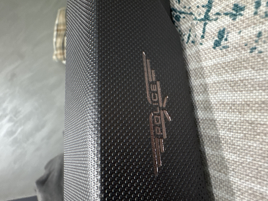 The scene, set within the city of Zhiten, Bulgaria, presents an indoor, static arrangement. A prominent, dark-grey, rectangular object, likely a case, occupies the central foreground. Its surface is uniformly textured with a dense pattern of small, raised circular dimples. Affixed to the side of this object is a metallic, rose-gold colored emblem featuring the stylized word "POLICE" flanked by horizontal, wing-like strokes. This object rests on a light-beige, coarsely woven fabric surface. A portion of this fabric, visible in the lower right, displays a sparse, abstract pattern in teal or dark green. The background is softly out of focus, revealing a light-colored, possibly textured wall. In the upper left background, a blurry, light-grey, soft fabric item is partially visible. In the upper right background, another indistinct object with a subtle beige and brown plaid or striped pattern is discernible. No individuals, actions, or direct interactions are depicted.