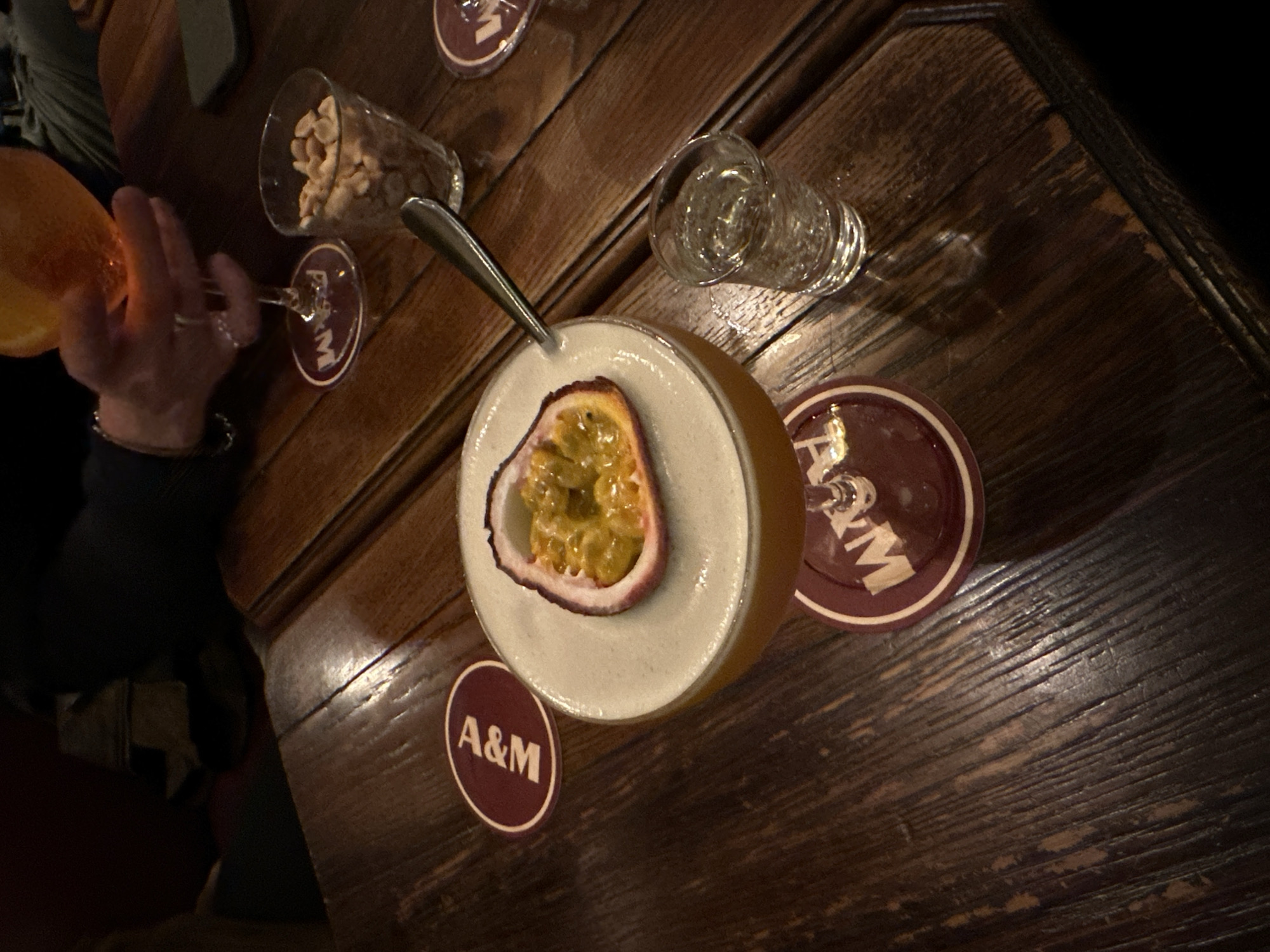 dark wooden table, likely in a bar or restaurant. On the table are several drinks and snacks. A cocktail, likely a passion fruit martini, dominates the center of the frame. A small glass of water sits next to it. A glass of nuts is also visible. The cocktails have A&M branded coasters. A person's hand holding a large orange can be seen. The setting is most likely in a location other than Paris, France, given the presence of the A&M branding. A spoon is in the cocktail.