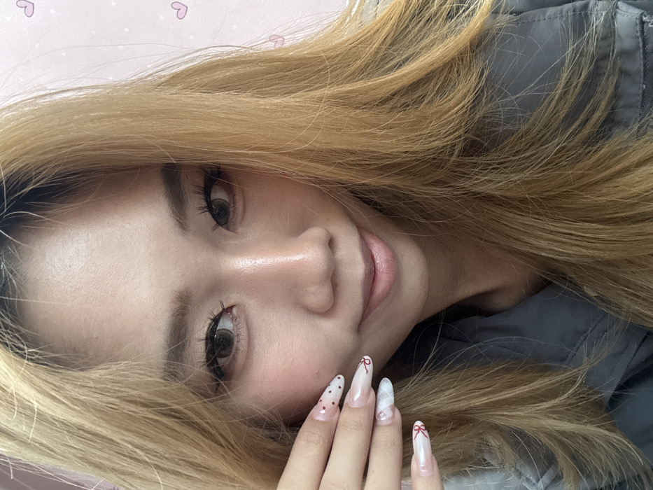 A young woman with blonde hair is captured in a close-up selfie. Her skin appears radiant and luminous. She gazes into the camera with soft, captivating eyes enhanced by subtle makeup. Her nails are long, almond-shaped, and adorned with decorative designs. A neutral-colored garment is visible at the edge of the frame. The background features a subtle pink hue with small heart motifs. The overall composition is intimate and focuses primarily on her face.