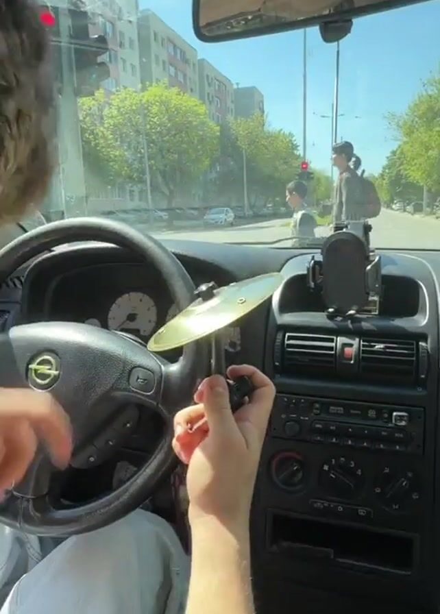 A person in a car is playing a small golden cymbal. The car is at a red light on a city street. The person is holding the cymbal in their left hand and tapping it with a drumstick. The car is an older model with a black dashboard. The street outside is lined with buildings and trees. There are people walking on the sidewalk.