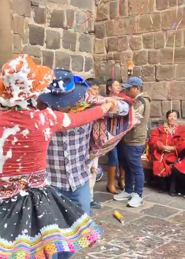 People dance in the street, covered in foam. Colorful streamers hang in the air and on the ground. The dancers wear traditional clothing and wide-brimmed hats. Many people are watching and taking pictures. A brick wall and a banner are in the background.