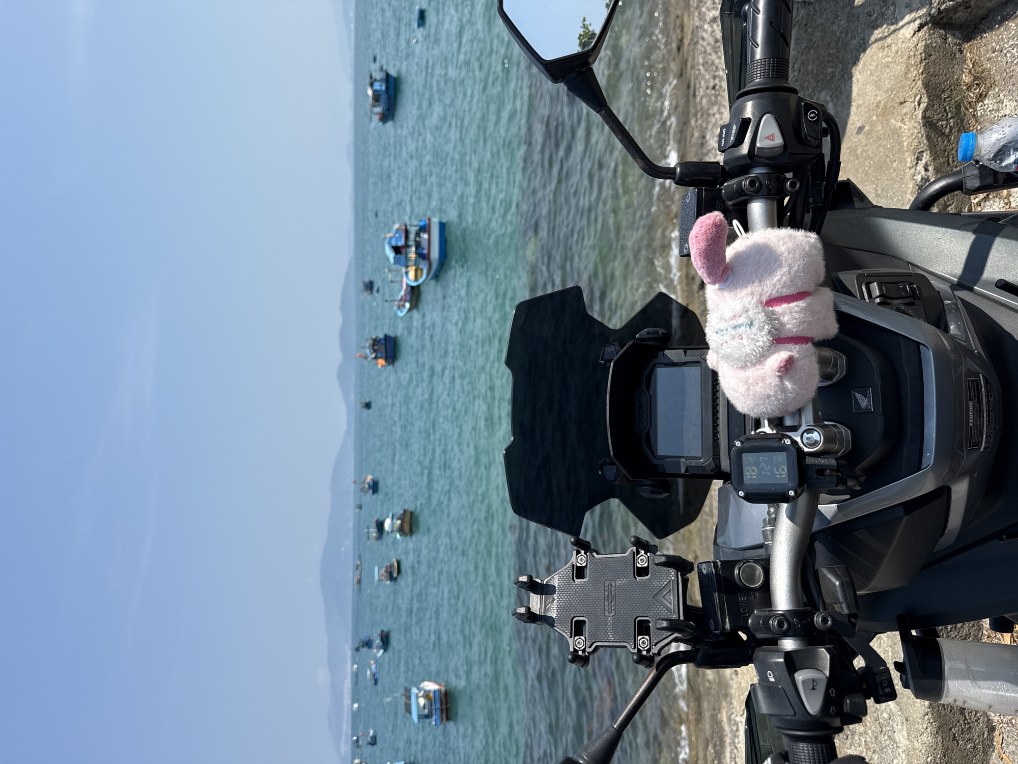 Captured from the rider's perspective, the image showcases the handlebars and dashboard area of a motorcycle parked near a coastline. The environment suggests Bắc Nha Trang, Vietnam, given the visible fishing boats scattered across the turquoise water under a clear sky. The coastline transitions from water to a concrete barrier where the motorcycle is presumably parked. The motorcycle's dashboard displays an electronic screen showing various metrics. Affixed to the handlebars is a phone mount. A pink bunny plush toy hangs on the handlebars. A water bottle is attached.