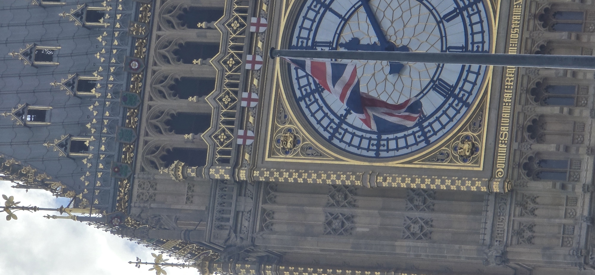 A vertical, close-up photograph depicts the upper section of the Elizabeth Tower, commonly known as Big Ben, located in the City of Westminster, London, United Kingdom. The image focuses on the ornate Gothic Revival architecture of the clock tower under an overcast sky. The tower's stone facade features intricate gold-leaf detailing, including trefoils, quatrefoils, and decorative balustrades. A dark gray slate roof with numerous dormer windows, also adorned with gold accents, crowns the structure. Below the roofline, arched windows are visible. The central feature is one of the tower's large clock faces, enclosed within a prominent gold border. The clock face is pale blue with dark blue Roman numerals marking the hours and smaller rectangular segments for minutes. Dark blue hour and minute hands are visible. Above the clock face, a frieze displays shields with red St. George's Crosses on a white background, interspersed with gold decorative elements. Below the clock face, a horizontal band features a Latin inscription in gold lettering, partially visible, which reads "DOMINE SALVAM FAC REGINAM NOSTRAM..." A dark gray flagpole stands vertically in the foreground, partially obscuring the lower right portion of the clock face. Attached to this pole is a Union Jack flag, depicted in red, white, and blue, unfurling to the left. No individuals or overt actions are discernible beyond the flag's movement.