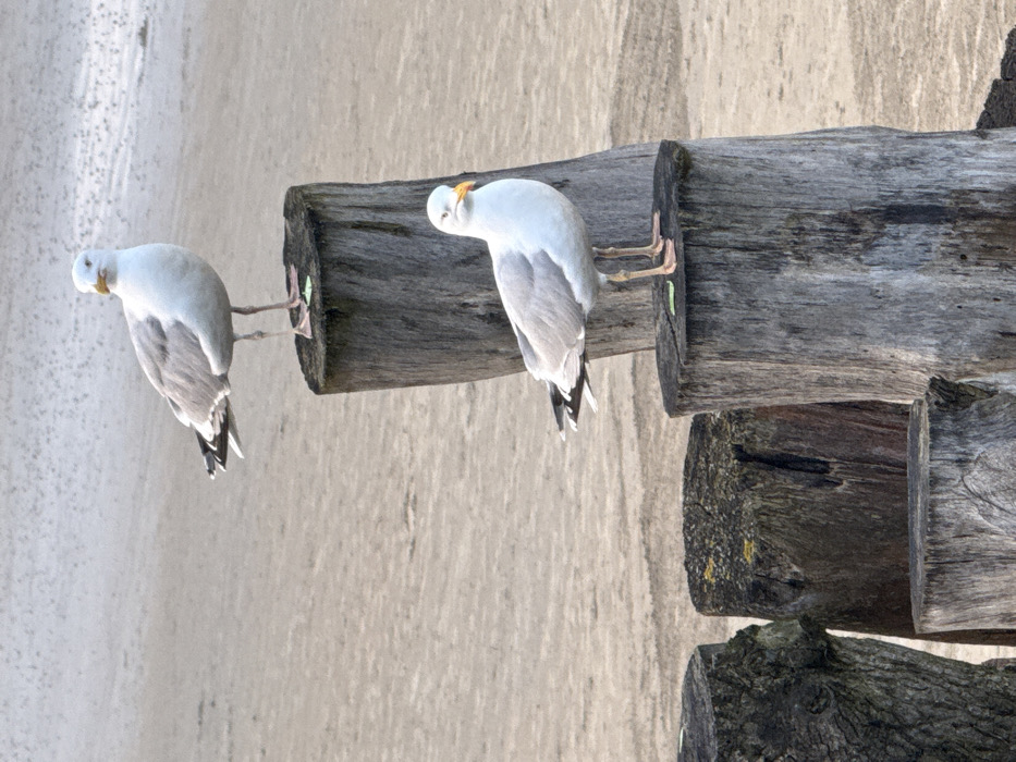 A coastal scene in Unknown, Unknown, features two gulls perched on weathered wooden posts