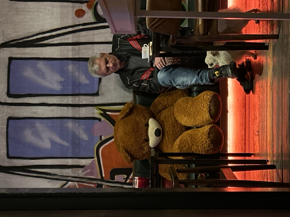 An older man in a black jacket and blue jeans sits at an outdoor table with a cup and saucer. Next to him is a large brown teddy bear occupying a chair. Under the table, a small white dog looks toward the man's leg. The background features a wall with graffiti-style art that looks like a subway train and an orange glow from the outdoor lighting.