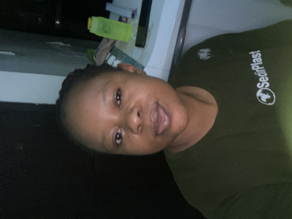 An adult female is depicted in a medium-shot, positioned slightly off-center to the left, facing directly towards the camera. She possesses dark skin, dark eyes, and dark braided hair. Her expression shows her mouth slightly open with the tip of her tongue protruding between her lips. She is wearing a dark green, long-sleeved crew-neck shirt with the white logo "SedirPlast" and a globe icon visible on the front. The lighting is dim, illuminating her face and the right side of the frame more distinctly than the left. The background to the left of the subject is a dark, indistinct surface, likely a wall or door. To the subject's right and extending behind her, a light-colored surface, possibly a table or countertop, holds several items. These include a translucent neon green plastic bottle with a yellow cap positioned upright, a dark rectangular object resembling a mobile phone lying flat, and several other less distinguishable objects or containers. The wall behind these items appears light gray or off-white. The scene is located in Kagini, Nigeria.