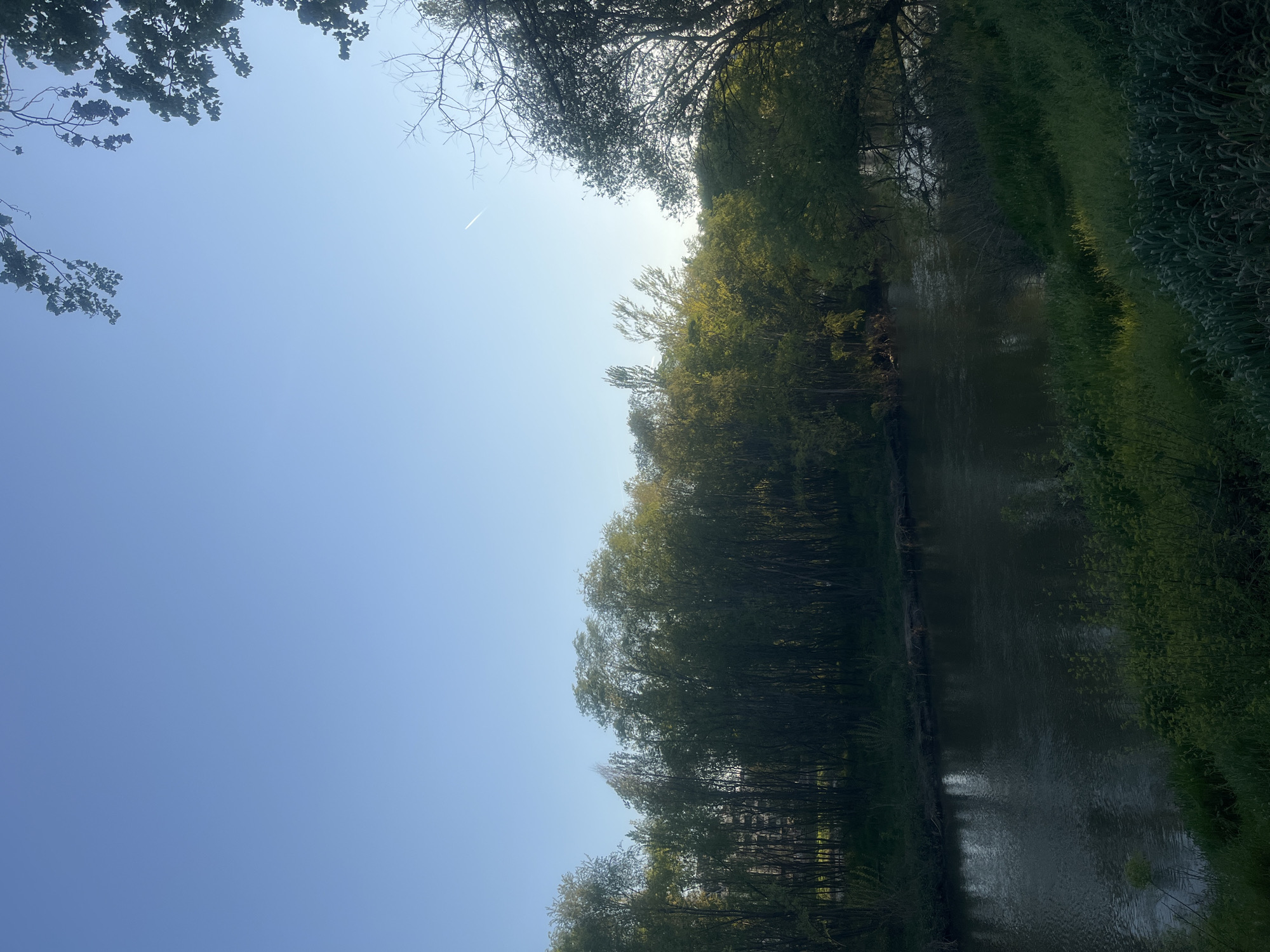 The image presents a river landscape in Plovdiv, Bulgaria. The river, positioned to the right, has dark-colored water. Both sides of the river are lined with trees and green vegetation. The sky is a bright, clear blue. Tree branches are partially visible in the top corners of the image. A contrail of a plane is visible in the upper left portion of the sky.
