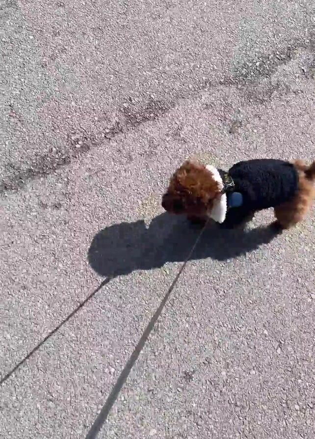 small, reddish-brown dog on a leash, wearing a black coat with white fur trim around the neck. The dog is walking on a paved surface. The camera angle is above the dog. The shadow of the person holding the leash is also visible on the pavement. The pavement has some discoloration.