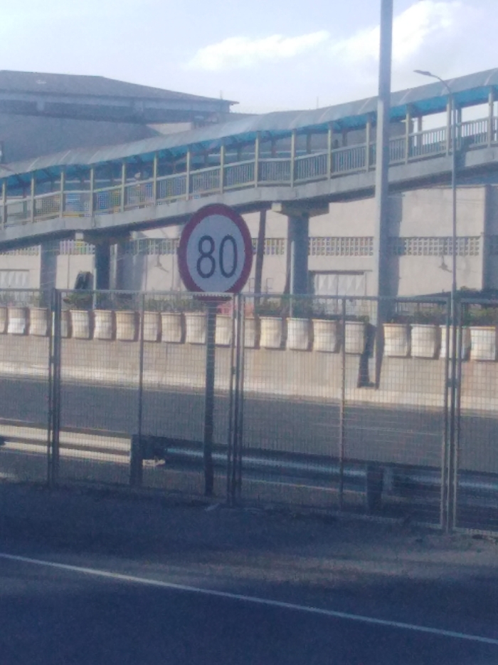 A roadside view features a round speed limit sign displaying "80." A pedestrian bridge with a blue roof and white railings spans overhead. Behind the sign and bridge, a long, light-colored wall with evenly spaced rectangular patterns runs parallel to the road. A metal fence separates the road from the wall. A utility pole and streetlight stand tall to the right. The sky is slightly overcast.