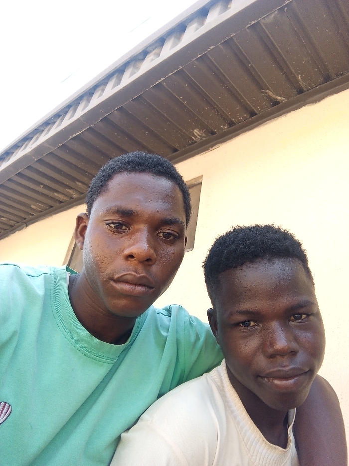 Two males, appearing to be in their late teens or early twenties, with dark complexions and short, dark hair, are positioned in close proximity, facing the camera