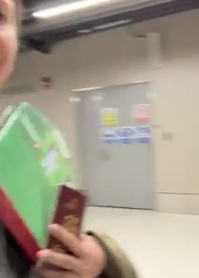 The video begins with a woman holding a green-covered board game and a maroon-covered passport, smiling at the camera. The camera then pans to show a brightly lit indoor walkway with a white floor and a high ceiling featuring a grid of metal beams. The walls are white with vertical red stripes. Several people are walking in the same direction, some pulling luggage. An emergency exit sign is visible.