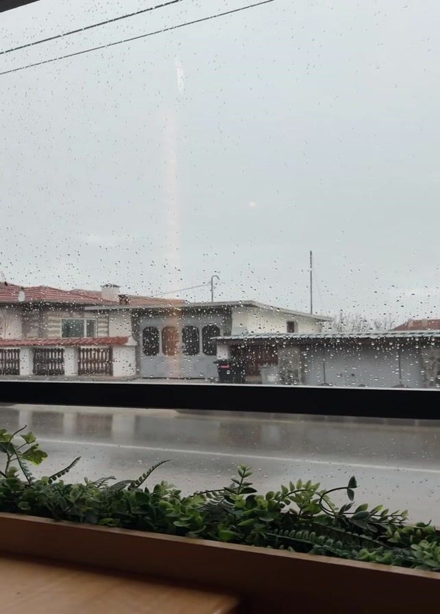 view through a window on a rainy day. Water droplets cover the glass. A planter with green foliage sits on a wooden surface in the foreground, below the window. Outside, across a wet road, are several houses with red tiled roofs. The sky is overcast and grey. A car briefly drives by.