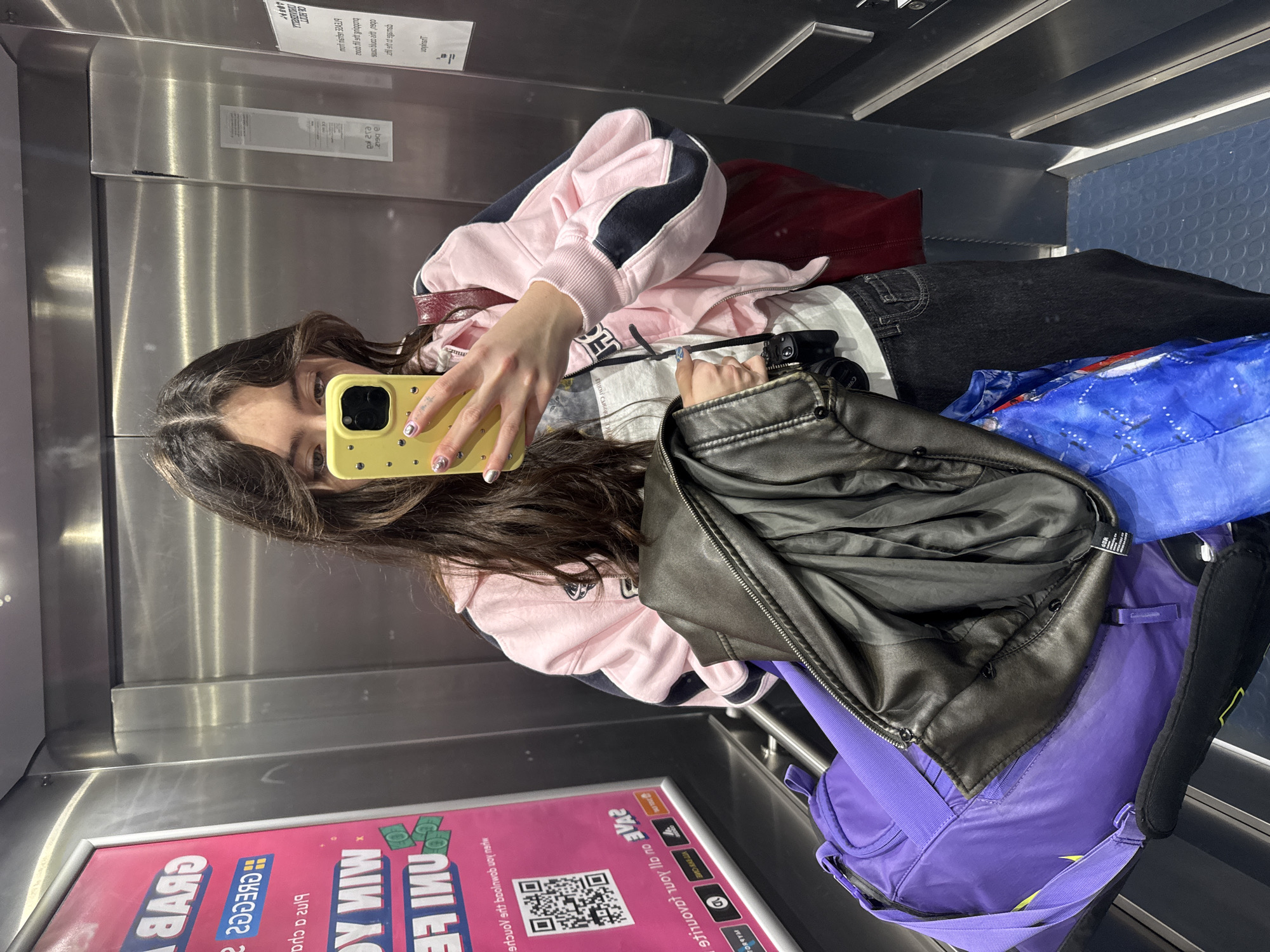 A young woman takes a selfie in an elevator. She is wearing a pink and navy sweatshirt, jeans, and has long brown hair. She holds a yellow smartphone in her right hand. There is a black leather jacket, a red bag, and a purple duffel bag near her. A poster with the words "WIN ME £" and a QR code is visible in the lower portion of the elevator. The poster contains other text as well. There is also a poster in the top right corner containing information about a company, including a logo. The elevator has brushed metal walls and a blue-patterned ceiling. Given that the QR code is visible and the poster contains language related to Hull and local businesses, it can be inferred that the location is in Hull, United Kingdom.