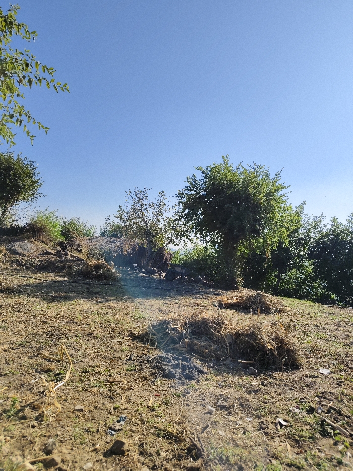 A sunny, clear blue sky overlooks a landscape with varying terrain. Patches of short grass and bare earth are visible in the foreground, with scattered piles of hay or dried plant matter. Further back, a collection of trees with green foliage creates a dense line, partially obscuring what may be a downward slope. A smaller tree sits between the trees and patches of greenery, adding depth to the scene.