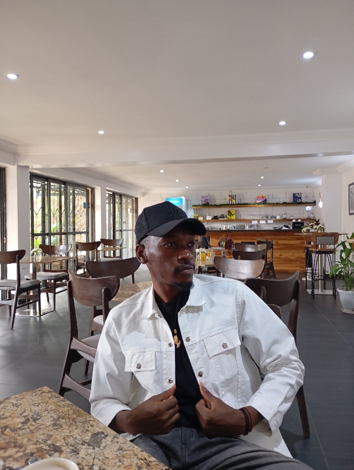 An adult male is seated in the foreground of what appears to be a cafe or lounge in Jos, Nigeria