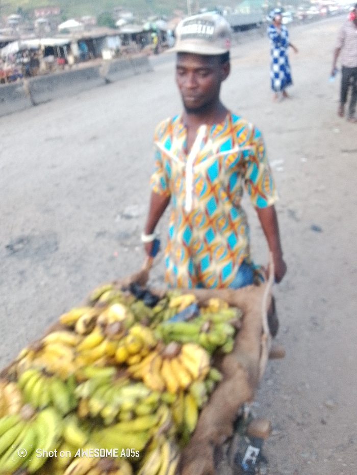 A man in a patterned shirt and baseball cap pulls a wheelbarrow laden with bananas, a mix of ripe yellow and green ones. The scene unfolds on a grey surface, possibly a road. In the background are buildings, indistinct figures, and a person in a blue patterned dress. A white wristband adorns the man's left wrist. The photograph is somewhat blurred. "Shot on AWESOME A05s" is watermarked in the bottom left corner.
