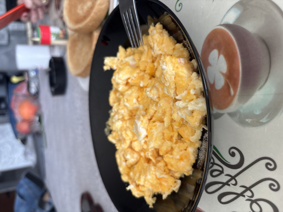 The scene depicts an indoor setting, likely a dining area, located in Balinovtsi, Bulgaria, during a mealtime. In the immediate foreground, a black round plate contains a generous portion of scrambled eggs, exhibiting yellow and white coloration with a soft, curdled texture. A silver-colored metal fork is partially inserted into the eggs on the right side of the plate. The plate is situated on a white placemat featuring ornate "Coffee" lettering on the left and a graphic of a light purple cup with a beverage displaying a white four-leaf clover latte art design. To the right of the main plate, two slices of lightly toasted bread are visible on a white plate. In the midground, a red and green spice shaker, a white cylindrical container, and a black circular ashtray are present on a grey, textured surface. The background is out of focus, revealing a human hand holding a red mobile phone on the far right, and blurred objects, including what appears to be orange-colored fruit.