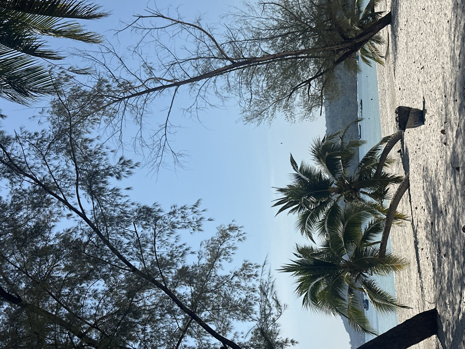 A beach landscape presents a scene of tropical tranquility. Palm trees lean over a sandy shore, their fronds casting shadows on the ground. A few boats rest on the water. On the left, the sky is partially obscured by lush tree branches with a clear blue sky above.