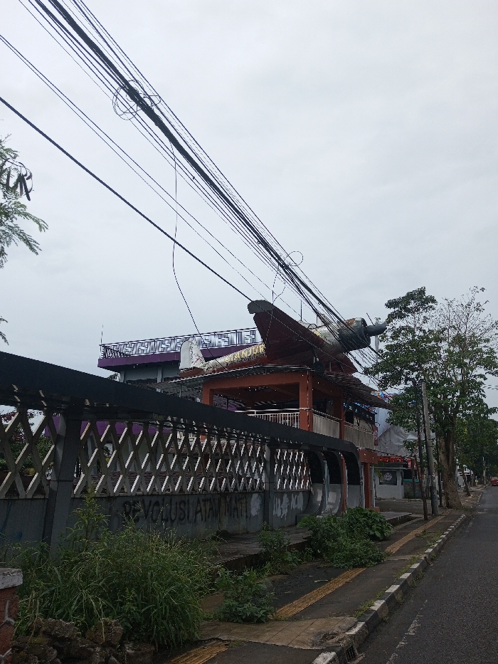 An outdoor scene in Kodarapalli, India, is depicted under an overcast sky. The image focuses on a street with a multi-story building featuring a large, partially intact airplane fuselage mounted on its roof. The airplane, an older propeller-driven model, is positioned with its tail section towards the left and its engine/propeller section towards the right, appearing as a static display or part of the building's facade. The building itself consists of at least two main sections. To the left, an upper floor balcony is visible with a distinctive purple color and a geometric patterned railing. Below the airplane, the building has an orange-brown painted section on its lower visible story. In the foreground, a dark-colored fence or wall with diamond-shaped cutouts runs parallel to the street. Below this fence, graffiti reading "REVOLUSI ATAU MATI" is visible on the lower section of the wall. Overgrown green vegetation and weeds are present along the base of this wall and in the unpaved areas beside the sidewalk. A concrete sidewalk with yellow tactile paving strips and a curb lines the street. An asphalt road, visible to the right, extends into the distance, where a faint red vehicle can be discerned. Utility poles and a dense tangle of black electrical or communication cables span overhead across the scene. Several trees with varying foliage density line the right side of the road. No individuals are visible in the image.