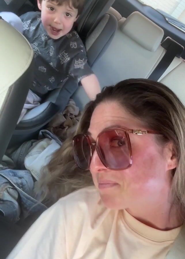 In the video, a woman in a car is taking a selfie while her young son is behind her in a car seat
