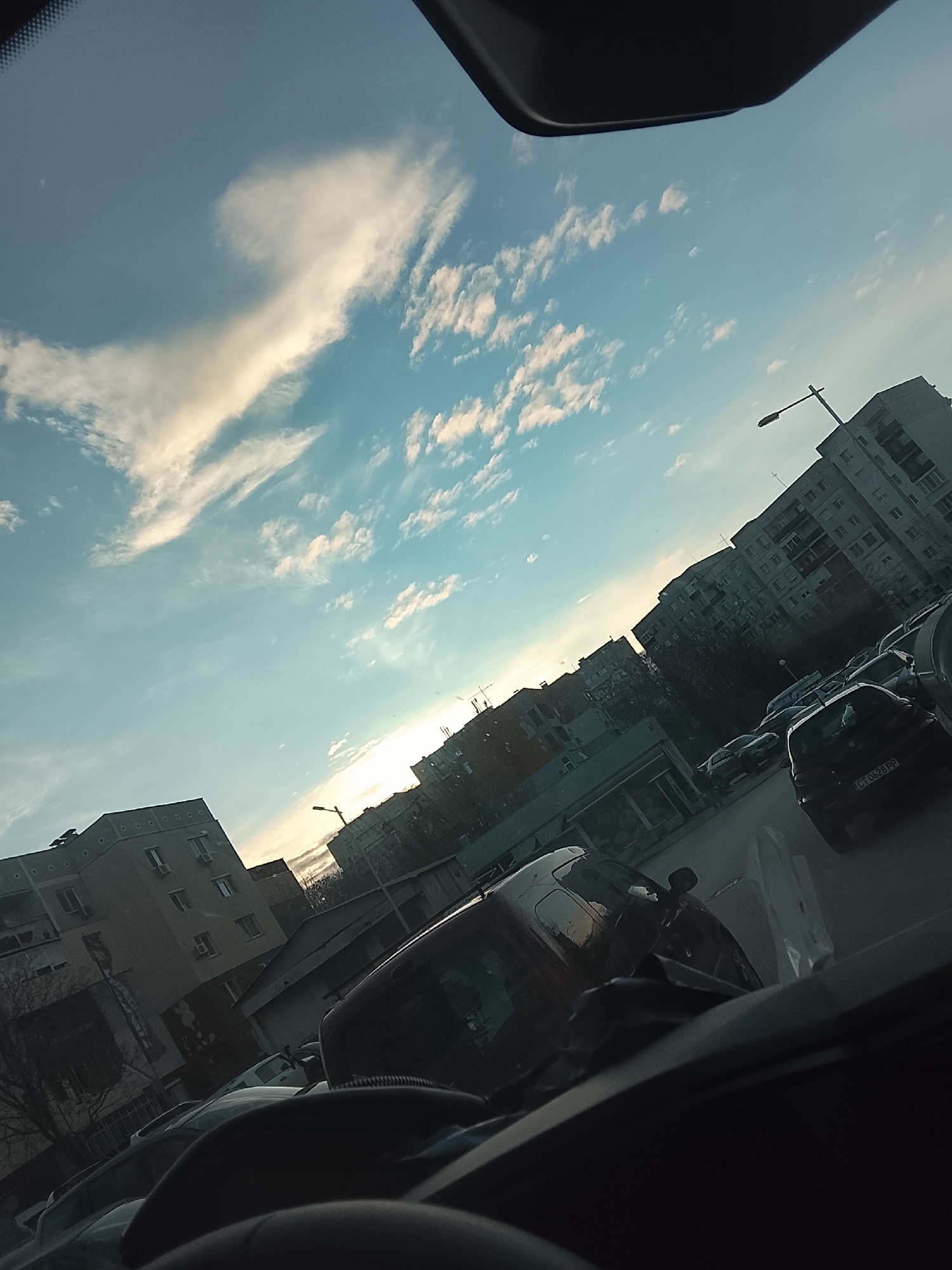 The image, taken from inside a vehicle, depicts a street scene in Plovdiv, Bulgaria. The sky is partly cloudy with blue patches. Several multi-story residential buildings are visible along the street, alongside parked cars. A black van and a black car with license plate "CT 0628 PP" are prominent. The sun is low on the horizon, suggesting dawn or dusk. The viewpoint is from the driver's seat of the vehicle. The overall impression is of a typical urban street scene in Bulgaria.