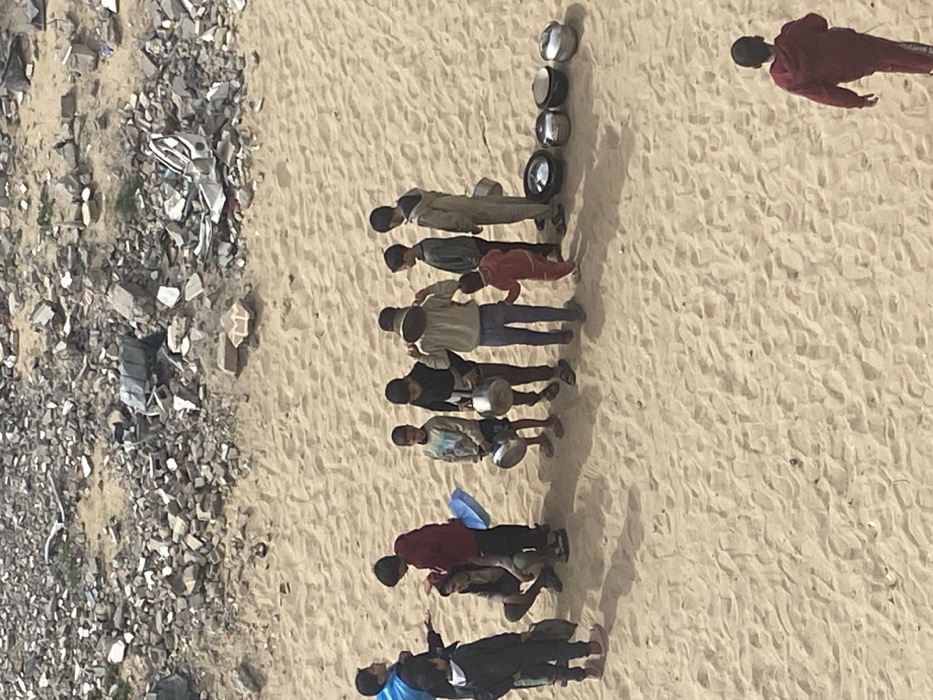 The image displays approximately twelve individuals, primarily children and young adolescents, standing on sandy ground in Khan Yunis, Palestinian Territory. The background reveals a wide expanse of rubble, fragmented concrete, and distorted metal debris. In the central area, a group of ten to eleven individuals is gathered. Many members of this group hold or carry various metal pots, bowls, and blue plastic containers. One individual near the center carries a large metal pot on their shoulder. To the immediate right of this group, five to six empty metal pots and bowls are arranged in a line on the sand. A smaller child in a red jumpsuit stands within this central gathering, appearing to hold the hand of a taller individual. On the far left, one child wearing a blue top extends an open hand towards another child. Separated from the main group, a solitary child in a red tracksuit walks across the foreground from right to left. The sandy ground exhibits ripples and footprints. Shadows indicate an overhead light source. The overall environment suggests a site of extensive demolition or damage.