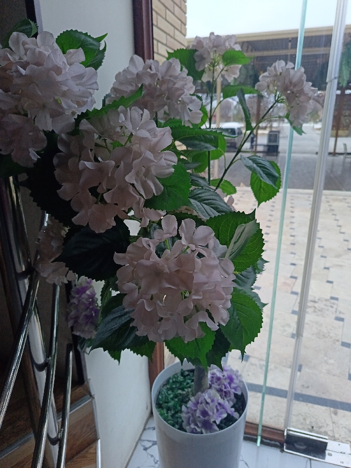 - "A potted plant with numerous clusters of light pink to white flowers and dark green leaves occupies the foreground, positioned in a tall, white cylindrical planter" by FM-a8p7q1, licensed under CC BY 4.0