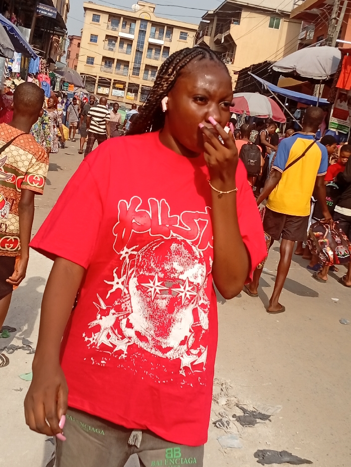 The image captures a bustling street market scene in Fegge, Nigeria, under bright daylight. In the foreground, a person with dark skin, braided hair, and pink manicured fingernails is positioned slightly to the left, looking directly at the viewer. This individual wears a red t-shirt adorned with a large white graphic depicting a skull with star-shaped glasses and text, and dark-colored pants with "BALENCIAGA PARIS" printed in light green. White wireless earbuds are visible in both ears, and a thin gold-colored bracelet is on the right wrist. The person's right hand is raised near their mouth. The background reveals a densely populated market area. Numerous individuals are visible, walking and congregating. To the immediate left, a person in a patterned orange, brown, and white short-sleeved top is seen from the back. To the right, another person in a yellow and blue t-shirt, also seen from the back, carries a black shoulder bag. Market stalls line both sides of the street, featuring grey and red fabric awnings under which clothing and other goods are displayed. In the mid-distance, a multi-story building with balconies is prominent. The ground consists of an unpaved or lightly paved surface, marked by scattered debris and dark material.