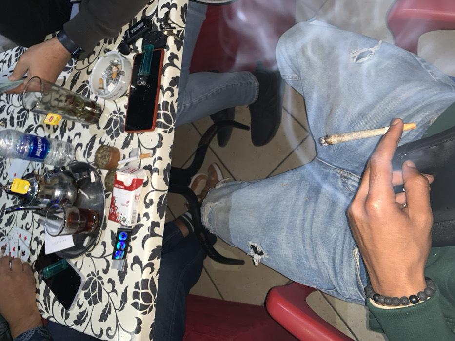A table is cluttered with various items, including a water bottle, teapot, glasses, a cigarette pack, and an ashtray filled with cigarette butts. A mobile phone and playing cards are also visible. A person holds a lit marijuana cigarette. Another person sits nearby wearing jeans and boots. Smoke fills the air. The scene appears to depict people gathered around a table, possibly socializing and smoking.