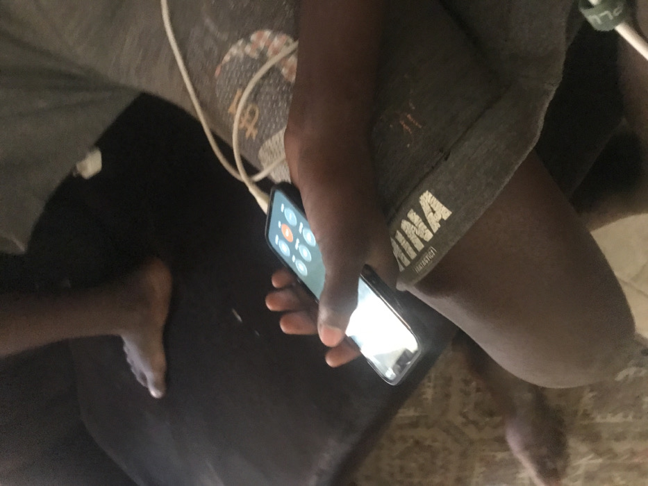 An undetermined indoor location. The image depicts two individuals in close proximity. In the upper left, a bare, dark-skinned left foot is visible, resting on a dark upholstered surface, consistent with a sofa or cushion. In the foreground, a dark-skinned right arm and hand hold a black smartphone in portrait orientation. The phone's screen is illuminated, displaying a grid of six circular application icons, with additional text or icons at the top. A white charging cable is plugged into the bottom of the smartphone, extending upwards and out of frame to the right. The individual holding the phone is wearing grey shorts with white text "INA" and "(FANTASTIC)" visible on the lower left hem. A bare thigh is also visible. The immediate environment includes the dark upholstered surface and a light-colored, patterned floor or rug.
